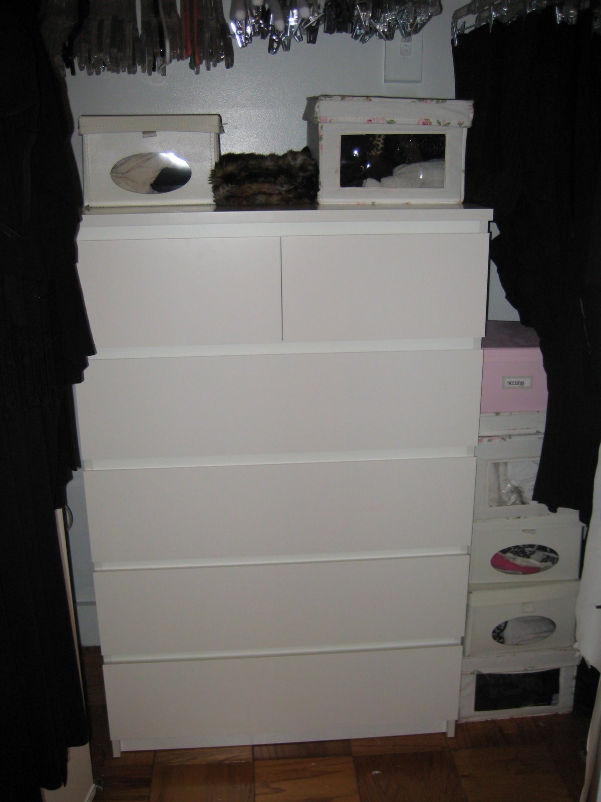 i couldn’t take living out of tiny hat boxes any longer. sure i have an entire wall of closet space, but it is my only storage space in 600 square feet so it also holds luggage, roller blades, gift bags, beach wear, linens, and my shoes. shoved inside multiple hat boxes were undies, camis, leggings, legwarmers, socks, stockings, and lounge wear. as you can see, the hat boxes were bursting at the seams. during yoga class on friday night, i had the grand idea of transferring all the product into a real life dresser. unfortunately there is no space in my boudoir for a dresser so i would have to make space in the closet. easy enough. headed to ikea, napped while beau put the beast together, off to some friend’s for v-day dinner, home at 1am and up until 3:30 am organizing it. topped the adventure off with scented damask drawer liners (see photo)!